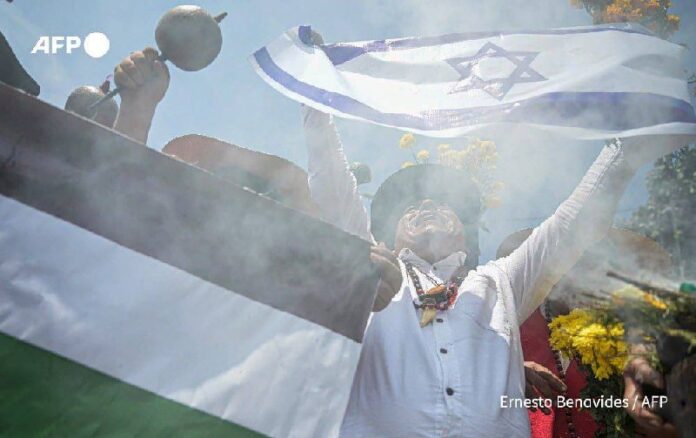 Aby sa pripravili na obrad, rozložili na zem prikrývky s obrázkami kvetov, listov a me?ov a tiež predviedli rituálne tance. Na vrchole kopca San Cristobal šamani vytiahli vlajky Izraela a Palestíny a požiadali vyššie mocnosti o mier na Blízkom východe.