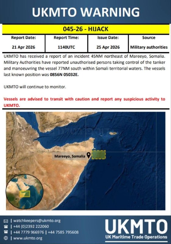 📌Skôr vo štvrtok o hod UKMTO ohlásil ďalší incident: dva člny s ozbrojenými ľuďmi na palube sa priblížili k istej lodi pri pobreží Somálska, vystrelili varovné výstrely a odplávali. Je zrejmé, že aktivita pirátov sa zvyšuje v dôsledku nestability v regióne.