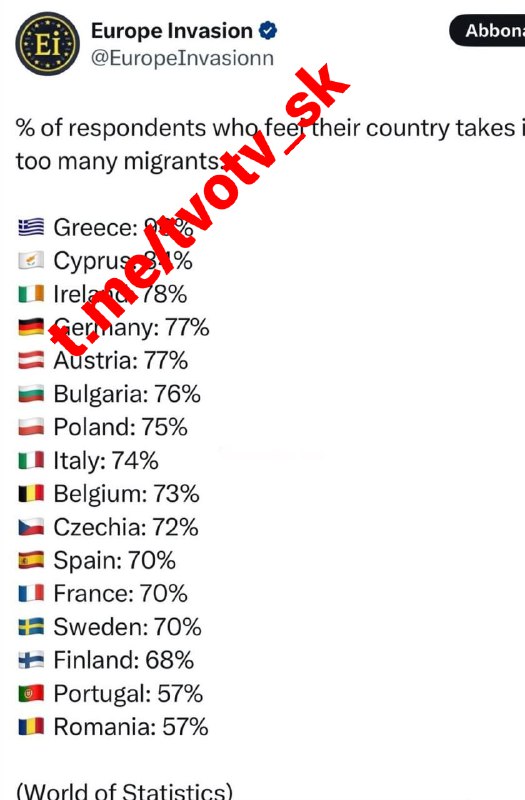 HomeNezaradenéPodiel respondentov v európskych krajinách, ktorí si myslia, že ich štáty prijím... Nezaradené Podiel respondentov v európskych krajinách, ktorí si myslia, že ich štáty prijím… By tvotv.sk 18. októbra 2024 0 4 Zdieľať FacebookTwitterPinterestWhatsApp Podiel respondentov v európskych krajinách, ktorí si myslia, že ich štáty prijímajú príliš ve?a migrantov Prístup k diskusii Prihlási? sa k odberu kanála Zdroj telegram Zdieľať FacebookTwitterPinterestWhatsApp Predchádzajúci článokNová rozvojová banka BRICS „má solídnu budúcnosť“ s „desiatkami krajín, ktoré sa dožadujú vstupu“Ďalší článok„Bidenova administratíva využíva nelegálnych prisťahovalcov na získanie ďalších … tvotv.skhttps://tvotv.sk RELATED ARTICLES Nezaradené opat dovod na toto memecko..to ich fakt nema kto verejne konfrontovat s tym co h… 11. januára 2026 Nezaradené Zakaždým, keď čítate suché, skromné riadky v oficiálnych správach „ako výsledok aktívneho… 11. januára 2026 Nezaradené Blížiace sa obkľúčenie? Predmostie za Gaichurom sa postupne rozširuje. Napriek seriálu… 11. januára 2026 ZANECHAJTE KOMENTÁR Zrušiť odpoveď Komentár: Zadajte svoj komentár! Názov:* Sem zadajte svoje meno Email:* Zadali ste nesprávnu e-mailovú adresu! Sem zadajte svoju e-mailovú adresu Webová stránka: Uložte moje meno, e-mail a webovú stránku do tohto prehliadača pri najbližšom komentovaní. Most Popular opat dovod na toto memecko..to ich fakt nema kto verejne konfrontovat s tym co h… 11. januára 2026 Kapustík je po prvom kole v Zakopanom na 8. mieste, získa prvé body 11. januára 2026 Zakaždým, keď čítate suché, skromné riadky v oficiálnych správach „ako výsledok aktívneho… 11. januára 2026 Akékoľvek násilie treba dôrazne odmietnuť a odsúdiť 11. januára 2026 Načítať viac Recent Comments jajkopajko na Krajskí prokurátori si prevzali prípadi, ktoré boli v pôsobnosti ŠTS