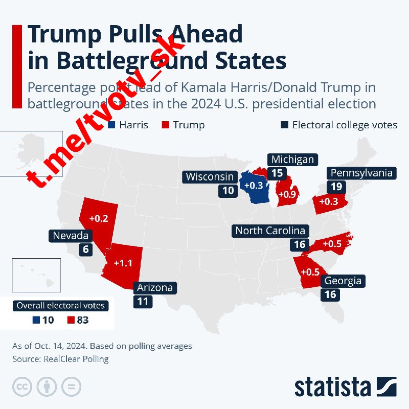 Momentálne najvä?ší náskok Trump zaznamenal v Arizone s rozdielom 1,1 percentuálneho bodu, zatia? ?o ostatné výhody ako Georgia, Nevada, Severná Karolína a Pensylvánia boli ove?a menšie. Len Harrisovej náskok vo Wisconsine zodpovedá 10 hlasom volite?ov, zatia? ?o Trump by dnes mal 83 hlasov.