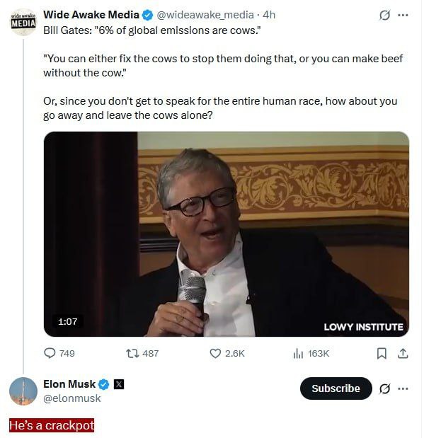 HomeNezaradenéPodľa Gatesa 6 % globálnych emisií vytvárajú kravy.Musk nazval Billa Gatesa „blá... Nezaradené Podľa Gatesa 6 % globálnych emisií vytvárajú kravy.Musk nazval Billa Gatesa „blá… By tvotv.sk 2. augusta 2025 0 16 Zdieľať FacebookXPinterestWhatsApp Pod?a Gatesa 6 % globálnych emisií vytvárajú kravy. Musk nazval Billa Gatesa „bláznom“.🤣🤣🤣👍👍👍 Zdroj telegram Zdieľať FacebookXPinterestWhatsApp Predchádzajúci článokMalinovo, Zálesie a Most pri Bratislave zvažujú zriadiť obecnú políciuĎalší článokAkcie v USA majú za sebou stratový týždeň tvotv.skhttps://tvotv.sk RELATED ARTICLES Nezaradené Biely dom prerokúva druhé kolo rozhovorov medzi USA a Iránom 16. apríla 2026 Nezaradené VIDEO: Austrália, ktorá je závislá od dovozu ropy cez Hormuzský prieliv, má po r… 16. apríla 2026 Nezaradené „Legitimné ciele“: Medvedev na zozname siete dronov ruského ministerstva obrany prepojenej s Ukrajinou 16. apríla 2026 Most Popular Lavrov: USA chcú, aby európske štáty NATO „zadržali Rusko“ 16. apríla 2026 VIDEO: „Nazývajú nás teroristami a oni vraždia kohokoľvek, kdekoľvek a kedykoľve… 16. apríla 2026 TK strany SMER-SSD – Čo natárala opozícia 16. apríla 2026 Biely dom prerokúva druhé kolo rozhovorov medzi USA a Iránom 16. apríla 2026 Recent Comments jajkopajko na Krajskí prokurátori si prevzali prípadi, ktoré boli v pôsobnosti ŠTS