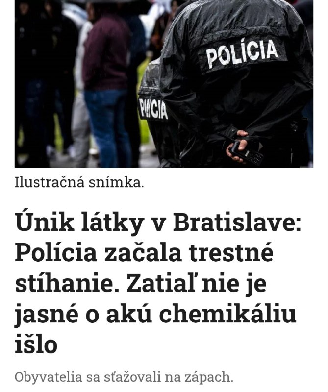 Pod?a informácií polície je za únikom chemikálie poškodenie tlakovej nádoby po?as demola?ných prác v areáli chemického závodu. O akú látku išlo však nespresnila. „?alšie okolnosti prípadu sú predmetom vyšetrovania,“ dodala polícia Bratislavského kraja v príspevku.
