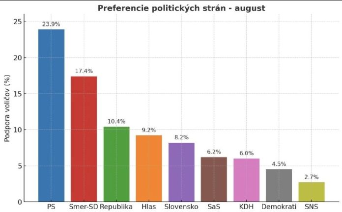 Pod?a prieskumu NMS PS v auguste výrazne posilnilo svoju pozíciu a s 23,9 % má jasný náskok pred Smerom-SD, ktorý klesol na 17,4 %, ?o je jeho jeden z najs labších výsledkov po?as štvrtej Ficovej vlády. Republika si drží stabilnú tretiu pozíciu (10,4 %), zatia? ?o Hlas pokra?uje v poklese (9,2 %).