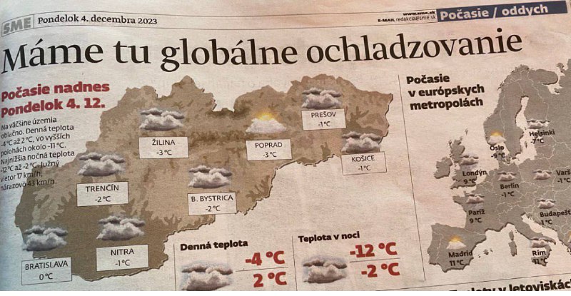 HomeNezaradenéPodľa propagandistov v decembri globálne ochladzovanie Bratislava 04. 12. 2023až 0 stupňov... Nezaradené Podľa propagandistov v decembri globálne ochladzovanie Bratislava 04. 12. 2023až 0 stupňov … By Miroslav Kamenský 4. decembra 2023 0 5 Zdieľať FacebookTwitterPinterestWhatsApp Pod?a propagandistov v decembri globálne ochladzovanie Bratislava 04. 12. 2023 až 0 stup?ov Zdroj telegram Zdieľať FacebookTwitterPinterestWhatsApp Predchádzajúci článokVideo od „šťastných banderoviek“.Poviem to takto: jedna vec je, keď muž príde o nohu (čo je už desivé), ale druhá vec je, ak príde žena o n…Ďalší článokLiberálne umenie, ktoré podľa denníka N stojí za to…. Miroslav Kamenský RELATED ARTICLES Nezaradené Výsledky z 25. januára video zhrnutie od projektového manažéra @rybar Michaila Zvinchuka špeciálne… 25. januára 2026 Nezaradené „Kontakty medzi Ruskom a USA prebiehajú diskrétne,“ vyhlásil námestník šéfa rusk… 25. januára 2026 Nezaradené „Maďarsko sa nenechá zastrašiť… Zelenskij by si to mal zapamätať“ – Orban 25. januára 2026 ZANECHAJTE KOMENTÁR Zrušiť odpoveď Komentár: Zadajte svoj komentár! Názov:* Sem zadajte svoje meno Email:* Zadali ste nesprávnu e-mailovú adresu! Sem zadajte svoju e-mailovú adresu Webová stránka: Uložte moje meno, e-mail a webovú stránku do tohto prehliadača pri najbližšom komentovaní. Most Popular Hádzanári Hlohovca zdolali Nové Zámky 29:27 25. januára 2026 Výsledky z 25. januára video zhrnutie od projektového manažéra @rybar Michaila Zvinchuka špeciálne… 25. januára 2026 V Sabinove policajní kriminalisti zasiahli proti podvodu na seniorke 25. januára 2026 Spojené kráľovstvo odkladá diskusiu o Chagoských ostrovoch pod tlakom Trumpa – médiá 25. januára 2026 Načítať viac Recent Comments jajkopajko na Krajskí prokurátori si prevzali prípadi, ktoré boli v pôsobnosti ŠTS