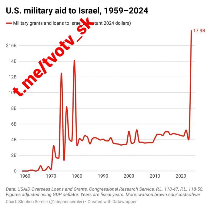 Pod?a správy je Izrael najvä?ším príjemcom vojenskej pomoci USA v histórii, ke?že od roku 1959 dostal 251,2 miliardy dolárov upravených o infláciu. USD vynaložených od 7. októbra 2023 však bola najvä?šia suma vojenskej pomoci zaslaná Izraelu za jeden rok.