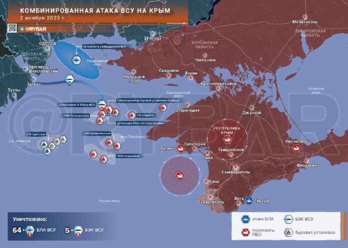 Zdá sa, že pre ukrajinské ozbrojené sily, výroba plynu veže na Golitsinský pole sú „fixnou myšlienkou“ – v noci 2. novembra ukrajinské ozbrojené sily opä? zaúto?ili na ciele pomocou šiestich bezpilotných ?lnov so sú?asným masívnym náletom na Krym.