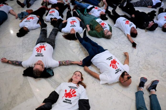 ?ahli si a skandovali: „Kongres má na rukách krv, teraz rozmrazte pomoc“, ?ím vyjadrili svoj nesúhlas s opatreniami vlády na obmedzenie aktivít USAID.