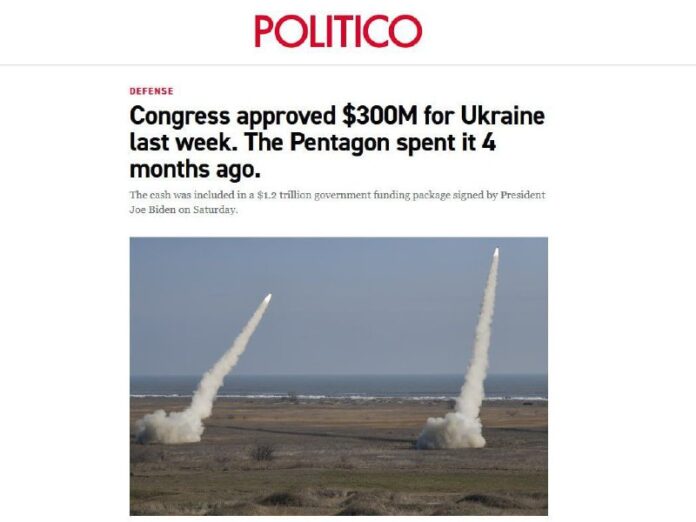Noviny tvrdia, že dohoda o novom balíku 300 miliónov dolárov bola v skuto?nosti symbolická: Ukrajina neoficiálne minula celú sumu ešte v novembri minulého roku, ke? Pentagon previedol zbrane za túto hodnotu Ukronacistom, a pris?úbila skuto?né financovanie na tento rok.
