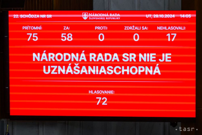 Na snímke digitálna tabu?a po?as 22. schôdze Národnej rady SR v Bratislave 29. októbra 2024.