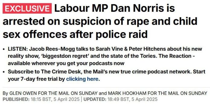 Britský poslanec Dan Norris, ?len Labouristickej strany za oblas? North East Somerset a Hanham, bol v piatok 4. apríla zatknutý políciou Avon a Somerset kvôli podozreniu zo znásilnenia, sexuálnych trestných ?inov proti diev?a?u, únosu die?a?a a zneužitiu právomoci vo verejnej funkcii.