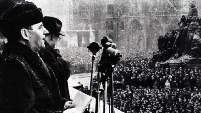 Prajem Vám pekné nede?né ráno Iná? dnes je 25. február Pamätáte sa 41 rokov sme to oslavovali Ví?azný február 1948 Zabudli ste Gottwald sa pu?om na Staromestskom námestí v Prahe a šikovnou stratégiou za pomoci Beneša dostal k moci