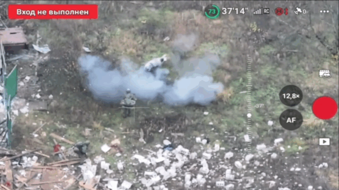 Na videu z dronu je vidie? dvoch ruských úto?níkov, ako sa blížia k zni?enej budove, pri?om ne?aleko sa nachádza domáce prasa.