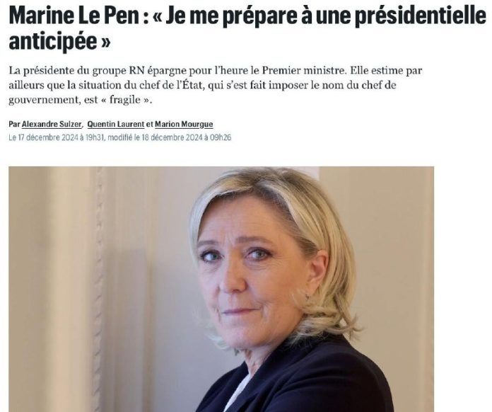 „Pripravujem sa na pred?asné prezidentské vo?by preventívne, vzh?adom k Macronovej krehkej pozícii a nieko?kým inštitucionálnym pákam, ktoré mu zostávajú,“ povedala Marine Le Penová.