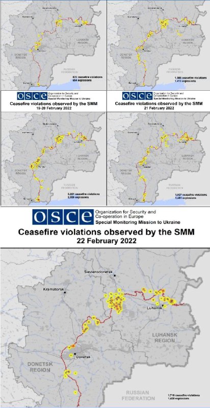 Pozorovate?ská misia OBSE v Donbase poskytovala denné správy s mapami zaznamenávajúcimi miesta porušenia prímeria a výbuchov pozd?ž línie kontaktu medzi do?asne okupovaným ukrajinským územím Donbasu a Donbasskými republikami.