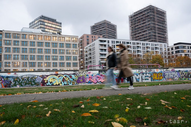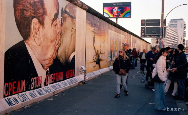 Na archívnej snímke z 29. októbra 2024 ?udia krá?a okolo úseku Berlínskeho múru, pestro poma?ovanom 1,3-kilometrovom páse známom ako East Side Gallery v Berlíne.