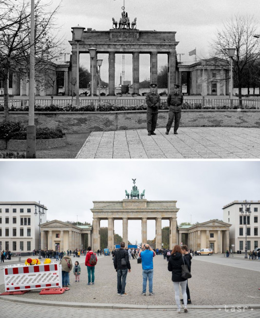 Na kombosnímke Brandenburská brána v Berlíne 4. septembra 1989 (hore) a 30. októbra 2024. Berlínsky múr – najznámejší symbol studenej vojny, ktorý viac ako 28 rokov rozde?oval nielen rodiny, mesto, krajinu, ale aj celý svet padol pred 35 rokmi.