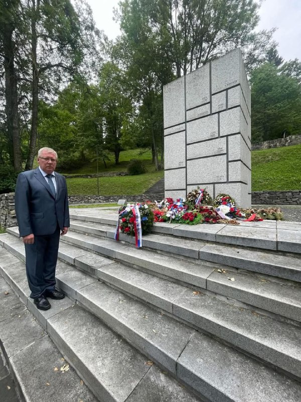 Na fotografii: ruský ve?vyslanec I. B. Brat?ikov a ruská mládežnícka delegácia potomkov ú?astníkov SNP v Kališti v rokoch 2023 a 2024.