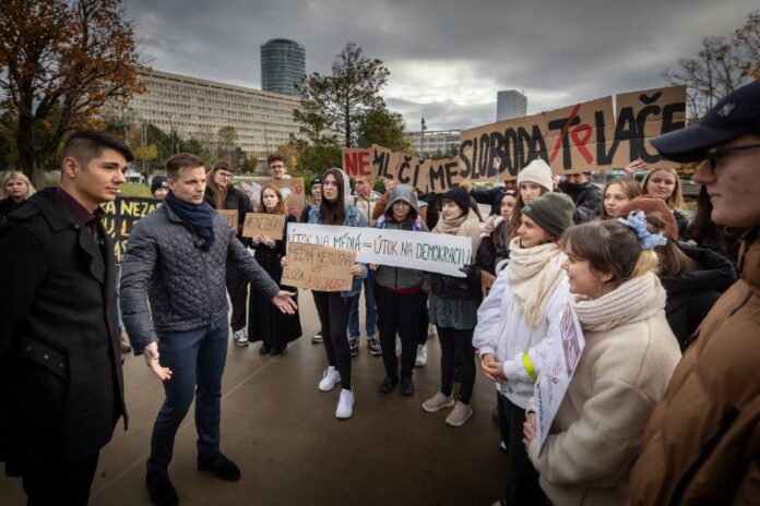 Pred budovou Úradu vlády vyjadrujú študenti žurnalistiky nesúhlas s postojom Roberta Fica k vybraným médiám, ktoré nazýva „nepriate?ské“, a vydal pokyn na preverenie ich prístupu.