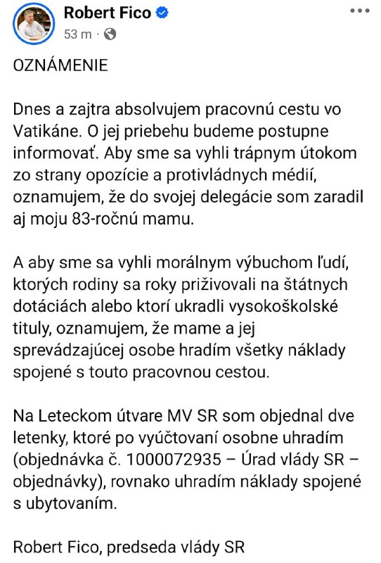 Premiér zárove? na sociálnej sieti informoval, že do delegácie zaradil aj svoju mamu. Ozrejmil, že mame a jej sprevádzajúcej osobe hradí všetky náklady spojené s pracovnou cestou.