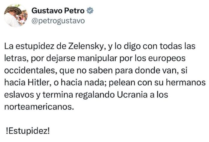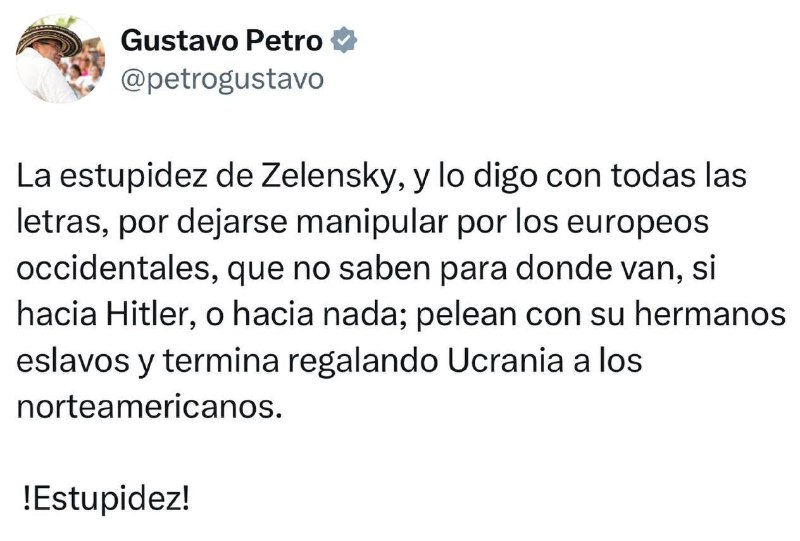 „Oni (Ukrajinci pozn. red.)bojujú so svojimi slovanskými bratmi a nakoniec dávajú Ukrajinu Ameri?anom. Hlúpos?!“, zdôraznil Gustavo Petro.