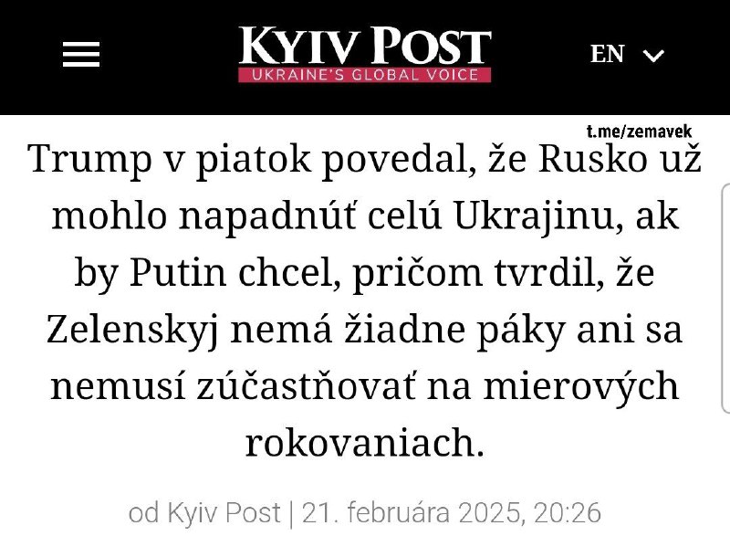 HomeNezaradenéPrezident Trump hovorí, že Vladimir Putin chce uzavrieť dohodu, ale nemusí, pre... Nezaradené Prezident Trump hovorí, že Vladimir Putin chce uzavrieť dohodu, ale nemusí, pre… By ZEMaVEK 22. februára 2025 0 16 Zdieľať FacebookXPinterestWhatsApp Prezident Trump hovorí, že Vladimir Putin chce uzavrie? dohodu, ale nemusí, pretože by si mohol vzia? celú Ukrajinu, „keby chcel“. /KP/ | odber t.me/zemavek Zdroj telegram Zdieľať FacebookXPinterestWhatsApp Predchádzajúci článokKaždá obeť má právo na pomoc, je dôležité nebáť sa to ohlásiťĎalší článokViac ako 120 otužilcov prejde cez Jánošíkove diery v plavkách ZEMaVEK RELATED ARTICLES Nezaradené Boj na prístupoch k SlavjanskuV smere Slavjansk sú ruské jednotky… 16. apríla 2026 Nezaradené Izrael zvažuje prímerie v Libanone, keďže pohraničné boje sa zintenzívňujú 16. apríla 2026 Nezaradené VIDEO: Západ na čele s USA a Európou sa zo všetkých síl snaží udržať si svoju do… 16. apríla 2026 Most Popular Boj na prístupoch k SlavjanskuV smere Slavjansk sú ruské jednotky… 16. apríla 2026 Izrael zvažuje prímerie v Libanone, keďže pohraničné boje sa zintenzívňujú 16. apríla 2026 Hádzanárky SR budú na ME v skupine so Švédskom, Nemeckom a Srbskom 16. apríla 2026 Hizballáh vykonal bombové útoky, pretože izraelské útoky v Libanone zabili viac ako 10 ľudí 16. apríla 2026 Recent Comments jajkopajko na Krajskí prokurátori si prevzali prípadi, ktoré boli v pôsobnosti ŠTS