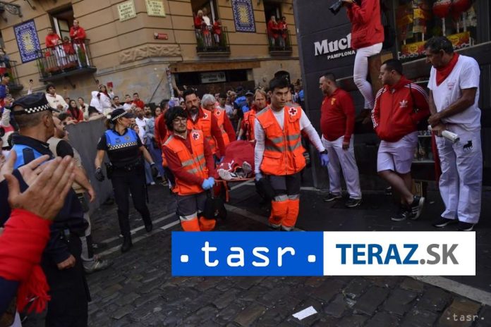 Na snímke zdravotníci odnášajú na nosidlách zaraneného ú?astníka po?as prvého d?a behu býkov, ktorý je sú?as?ou slávností sv. Fermína v španielskej Pamplone v nede?u 7. júla 2024.