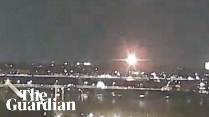 An American Airlines passenger jet collided with a military helicopter while landing at Ronald Reagan national airport near Washington DC. Video from an observation camera at the nearby Kennedy Center shows two sets of lights consistent with aircraft appearing…