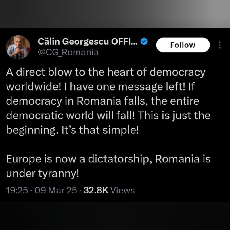 HomeNezaradené"Priamy úder do srdca demokracie po celom svete! Ak padne demokracia v... Nezaradené „Priamy úder do srdca demokracie po celom svete! Ak padne demokracia v Rumunsku… By ZEMaVEK 9. marca 2025 0 20 Zdieľať FacebookXPinterestWhatsApp „Priamy úder do srdca demokracie po celom svete! Ak padne demokracia v Rumunsku, celý demokratický svet padne!“ „V Európe je teraz diktatúra, Rumunsko je pod tyraniou!“ – C?lin Georgescu, kandidát na prezidenta, ktorému zakázali kandidova?. | odber t.me/zemavek Zdroj telegram Zdieľať FacebookXPinterestWhatsApp Predchádzajúci článokSlovenkám nevyšla štafeta, Kapustová: Veľmi ma to mrzíĎalší článokRumunsko zakázalo Kălinovi Georgescuovi kandidovať v májových prezidentských voľ… ZEMaVEK RELATED ARTICLES Nezaradené Vysoký predstaviteľ Trumpa vyvolal búrlivú diskusiu po tom, čo zaskočil demokratov v Snemovni reprezentantov v prelomových prípadoch Najvyššieho súdu USA – Fox News 29. apríla 2026 Nezaradené Bahrajn odsúdil piatich občanov na doživotie za údajnú špionáž spojenú s IRGC 29. apríla 2026 Nezaradené Spojené arabské emiráty odstupujú z OPEC a OPEC+ s platnosťou od 1. mája 29. apríla 2026 Most Popular Vysoký predstaviteľ Trumpa vyvolal búrlivú diskusiu po tom, čo zaskočil demokratov v Snemovni reprezentantov v prelomových prípadoch Najvyššieho súdu USA – Fox News 29. apríla 2026 Pred 120 rokmi sa konali voľby do Uhorského snemu 29. apríla 2026 Bahrajn odsúdil piatich občanov na doživotie za údajnú špionáž spojenú s IRGC 29. apríla 2026 M. Žilinka vyzýva na zastavenie útokov voči verejne činným osobám 29. apríla 2026 Load more Recent Comments jajkopajko na Krajskí prokurátori si prevzali prípadi, ktoré boli v pôsobnosti ŠTS