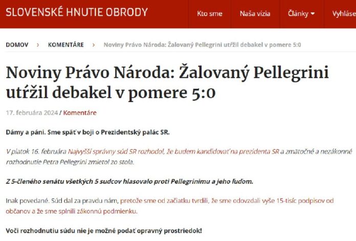 HomeNezaradenéPribudol oficiálne kandidát na prezidentaŠVEC späť v boji o prezidentský palác SR.16.... Nezaradené Pribudol oficiálne kandidát na prezidentaŠVEC späť v boji o prezidentský palác SR.16. februára Najvyšší správny súd SR rozhodol, že bude ka… By Miroslav Kamenský 19. februára 2024 0 2 Zdieľať FacebookTwitterPinterestWhatsApp Pribudol oficiálne kandidát na prezidentaŠVEC späť v boji o prezidentský palác SR.16. februára Najvyšší správny súd SR rozhodol, že bude kandidovať na prezidenta SR Zdroj telegram Zdieľať FacebookTwitterPinterestWhatsApp Predchádzajúci článokNa znak spolupatričnosti Ukrajincov a Slovákov zasadili strom vďakyĎalší článokSantander rozdelí akcionárom 5,5 miliardy po rekordnom zisku Miroslav Kamenský RELATED ARTICLES Nezaradené Kolaps moci v Gagauzii Moldavské úrady dosiahli v Gagauzii ústavnú krízu… 18. novembra 2025 Nezaradené Plán USA pre Gazu navrhnutý tak, aby podmanenie Palestíny získalo legitímnosť OSN – Mohammad Marandi 18. novembra 2025 Nezaradené Epsteinove súkromné lietadlá pristáli aj na Slovensku. Miroslav Lajčák ako minis… 18. novembra 2025 ZANECHAJTE KOMENTÁR Zrušiť odpoveď Komentár: Zadajte svoj komentár! Názov:* Sem zadajte svoje meno Email:* Zadali ste nesprávnu e-mailovú adresu! Sem zadajte svoju e-mailovú adresu Webová stránka: Uložte moje meno, e-mail a webovú stránku do tohto prehliadača pri najbližšom komentovaní. Most Popular Identifikovali sme 2 podozrivých z aktov sabotáže na železnici 18. novembra 2025 Aerolínia Air Europa plánujú kúpiť od Airbusu do 40 strojov A350-900 18. novembra 2025 Amnesty International po tragédii na Luníku IX kritizuje štát 18. novembra 2025 Nemecká aukcia artefaktov z nacistických vyhladzovacích táborov zrušená po protestoch 18. novembra 2025 Načítať viac Recent Comments jajkopajko na Krajskí prokurátori si prevzali prípadi, ktoré boli v pôsobnosti ŠTS