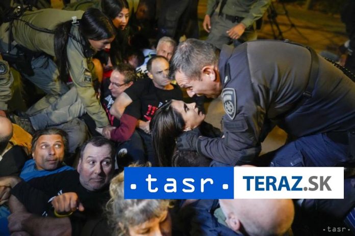 ?alší demonštranti sedeli so zaviazanými o?ami na podlahe na chodbách izraelského parlamentu – Knesetu – a v rukách držali plagáty s fotografiami rukojemníkov.