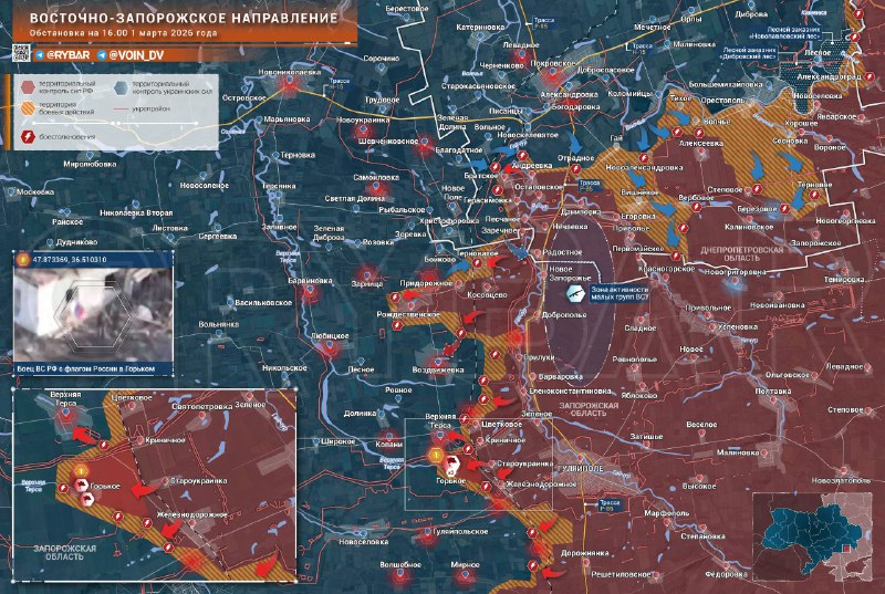 ➡️Do 28. februára jednotky 60. motostreleckej brigády vytlačili ukrajinské ozbrojené sily z r. Gorkij a vztýčili nad obcou štátne vlajky. Oslobodenie Gorkého umožní jednotkám hlavnej gardy Vostok rozvinúť ofenzívu ďalej na západ pozdĺž obrannej línie ukrajinských ozbrojených síl pozdĺž Upper Terse„sekanie“ nepriateľských formácií pozdĺž rieky.