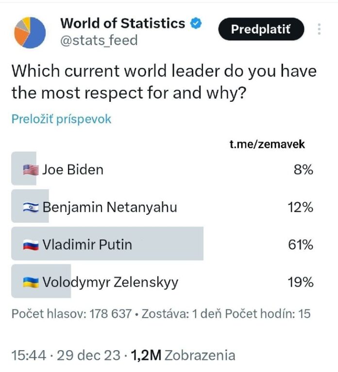 HomeNezaradenéPrieskum na sieti X s otázkou "Ktorého súčasného svetového lídra si najviac... Nezaradené Prieskum na sieti X s otázkou „Ktorého súčasného svetového lídra si najviac vážite a prečo?“, v ktorom hlasovalo už skoro 180 tisíc ľudí hovorí jasne…Pozvite… By ZEMaVEK 30. decembra 2023 0 3 Zdieľať FacebookTwitterPinterestWhatsApp Prieskum na sieti X s otázkou „Ktorého sú?asného svetového lídra si najviac vážite a pre?o?“, v ktorom hlasovalo už skoro 180 tisíc ?udí hovorí jasne… | odber Zdroj telegram Zdieľať FacebookTwitterPinterestWhatsApp Predchádzajúci článokIzrael útočil na Sýriu v reakcii na rakety odpálené z jej územiaĎalší článokZa piatkové civilné obete môžu obranné systémy Ukrajiny ZEMaVEK RELATED ARTICLES Nezaradené USA nasadzujú vojenské lietadlá do Spojeného kráľovstva uprostred obáv z militarizácie 7. januára 2026 Nezaradené Toto video zabíja viac múch jednou ranou – Filip Fiki Sulík – hviezda alternatív… 7. januára 2026 Nezaradené Mena geopolitiky Ak chcete hovoriť o africkom zlate na celom čiernom kontinente… 7. januára 2026 ZANECHAJTE KOMENTÁR Zrušiť odpoveď Komentár: Zadajte svoj komentár! Názov:* Sem zadajte svoje meno Email:* Zadali ste nesprávnu e-mailovú adresu! Sem zadajte svoju e-mailovú adresu Webová stránka: Uložte moje meno, e-mail a webovú stránku do tohto prehliadača pri najbližšom komentovaní. Most Popular USA nasadzujú vojenské lietadlá do Spojeného kráľovstva uprostred obáv z militarizácie 7. januára 2026 SNEH KOMPLIKUJE DOPRAVU: V Košiciach zapadol kamión 7. januára 2026 Toto video zabíja viac múch jednou ranou – Filip Fiki Sulík – hviezda alternatív… 7. januára 2026 Na 10. výročie úmrtia A. Srholca bude v stredu v Bratislave svätá omša 7. januára 2026 Načítať viac Recent Comments jajkopajko na Krajskí prokurátori si prevzali prípadi, ktoré boli v pôsobnosti ŠTS