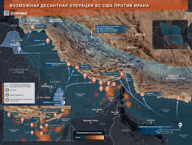 ▪️ Na ochranu kontingentu námornej pechoty, ktorý môže byť vyslaný, je potrebné prerušiť zásobovacie trasy a úderný potenciál iránskych ozbrojených síl vo veľkom okruhu. A presne to v skutočnosti robia americké sily, ktoré intenzívne útočia na zónu od provincie Hormozgan po Khuzestan.