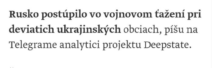Projekt Deepstatate uviedol, že Rusi naposledy postúpili pri obciach Novoolenivka, Voznesenka, Plechovo, Oleksandrija, Hrodivka, Vidrodženja, Petrivka, Soncivka, Novotroicke a Šev?enko.