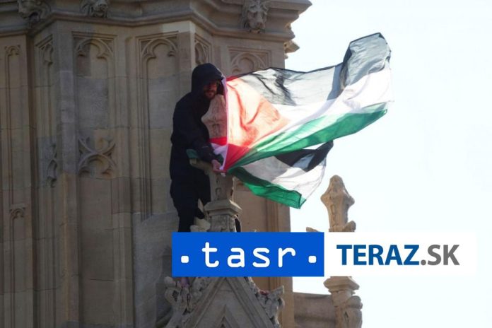 Muž od sobot?ajšieho rána naživo na sociálnych sie?ach streamoval, ako sa štverá na rímsu veže s palestínskou vlajkou a volal odtia? rôzne propalestínske heslá.