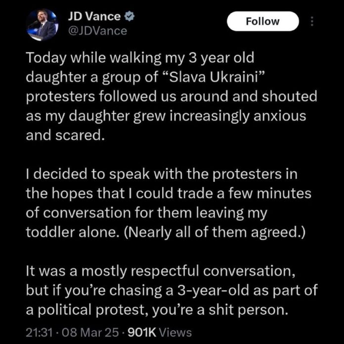 🇺🇸🇺🇦 Proukrajinskí demonštranti pri chôdzi nasledovali amerického viceprezidenta J. D. Vancea a jeho trojro?nú dcéru a skandovali: „Sláva Ukrajine“. Ako napísala Dee Vance na webe X-rated, diev?a bolo vystrašené.