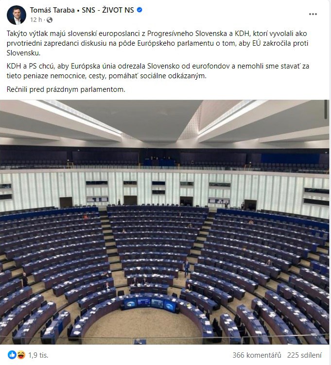 „Takýto výtlak majú slovenskí europoslanci z Progresívneho Slovenska a KDH, ktorí vyvolali ako prvotriedni zapredanci diskusiu na pôde Európskeho parlamentu o tom, aby EÚ zakro?ila proti Slovensku. KDH a PS chcú, aby Európska únia odrezala Slovensko od eurofondov a aby sme nemohli stava? za tieto peniaze nemocnice, cesty, pomáha? sociálne závislým. Re?nili pred prázdnym parlamentom,” napísal Taraba.