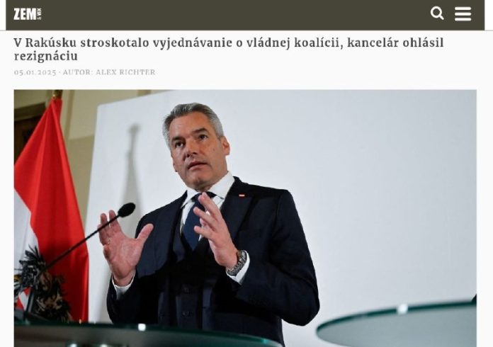 HomeNezaradenéRakúsky kancelár a šéf ľudovcov (ÖVP) Karl Nehammer v sobotu po krachu... Nezaradené Rakúsky kancelár a šéf ľudovcov (ÖVP) Karl Nehammer v sobotu po krachu rokovaní… By ZEMaVEK 5. januára 2025 0 12 Zdieľať FacebookXPinterestWhatsApp Rakúsky kancelár a šéf ?udovcov (ÖVP) Karl Nehammer v sobotu po krachu rokovaní o vládnej koalícii oznámil, že v najbližších d?och odstúpi z oboch funkcií… Celý ?lánok:https://zemavek.sk/v-rakusku-stroskotalo-vyjednavanie-o-vladnej-koalicii-kancelar-ohlasil-rezignaciu/ Zdroj telegram Zdieľať FacebookXPinterestWhatsApp Predchádzajúci článokIzrael varuje Hizballáh pred neplnením dohody o prímeríĎalší článokZ Moskvy chcem priniesť informácie a otvoriť ľuďom oči ZEMaVEK RELATED ARTICLES Nezaradené USA prehrávajú vojnu, ktorá sa ešte ani nezačalahttps://www.infovojna.com/articl… 16. apríla 2026 Nezaradené Trump o NATO: „Ak s nami nebudú, ak s nami nebudú v otázke Iránu, nebudú s nami … 16. apríla 2026 Nezaradené Kronika špeciálnej vojenskej operácie z 15. apríla 2026 ruských vojakov v… 16. apríla 2026 Most Popular Vo štvrtok rátajte aj s dažďom, bude však stále príjemne teplo 16. apríla 2026 Peking podporuje mierové rokovania, povedal Wang I v telefonáte 16. apríla 2026 Hokejisti Dynama Pardubice zdolali Spartu 1:0 a zahrajú si finále 16. apríla 2026 Hádzanári Tatrana Prešov zvíťazili v 9. kole nadstavbovej časti 16. apríla 2026 Recent Comments jajkopajko na Krajskí prokurátori si prevzali prípadi, ktoré boli v pôsobnosti ŠTS