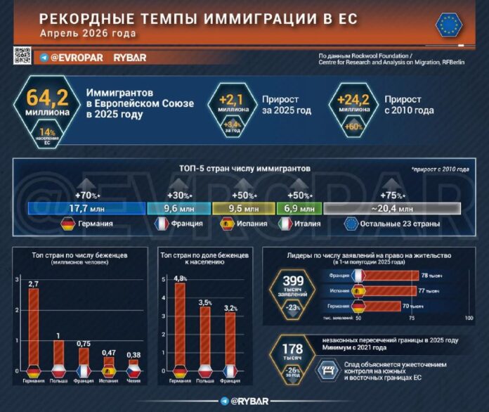 V roku 2025 počet imigrantov v Európskej únii dosiahnuté historické maximum — 64,2 milióna ľudí, čiže asi 14 % celkovej populácie bloku. Pre porovnanie, v roku 2010 ich bolo 40 miliónov. Medziročný nárast bol 2,1 milióna ľudí.
