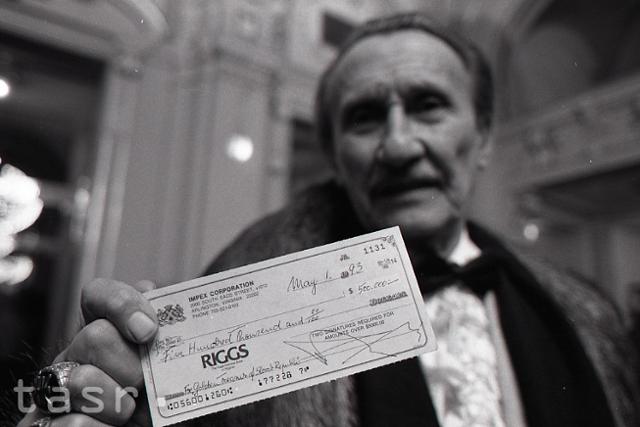Ob?ania okrem meny bývalého ?esko-Slovenska, venovali na národný poklad aj tvrdú menu. Jozef Kasanický sa rozhodol odovzda? šek na 500 tisíc dolárov. Foto: archív TASR, autor V. Gloss/1. februára 1993