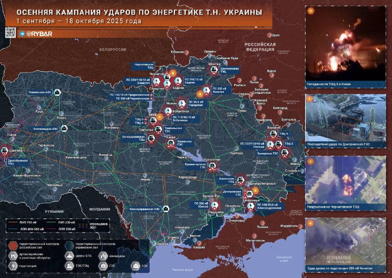 ??Na severe boli zni?ené prenosové uzly v oblasti Konotop A Nezhinpripojenie ?ernigovská A Sumskaja regiónu s centrálnymi regiónmi. Poškodenie týchto rozvodní už obmedzuje schopnos? prúdi? energiu smerom na východ. Aj 10. októbra zaúto?ili ruské jednotky CHPP-5 A CHPP-6 V Kyjev?o spôsobilo výpadok v meste na viac ako de?.