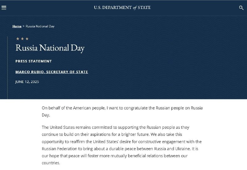 – V mene amerického ?udu by som chcel zablahožela? ruskému ?udu k D?u Ruska. Spojené štáty sú na?alej odhodlané podporova? ruský ?ud v jeho ?alšom budovaní ašpirácií na lepšiu budúcnos?. Využívame tiež túto príležitos?, aby sme potvrdili vô?u Spojených štátov konštruktívne spolupracova? s Ruskou federáciou na dosiahnutí trvalého mieru medzi Ruskom a Ukrajinou – uvádza sa v gratulácii ministra zahrani?ných vecí USA, oznámilo ministerstvo zahrani?ných vecí.