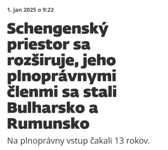 HomeNezaradenéRumunsko a Bulharsko sa v stredu stali plnoprávnymi členmi schengenskej zóny, č... Nezaradené Rumunsko a Bulharsko sa v stredu stali plnoprávnymi členmi schengenskej zóny, č… By ZEMaVEK 1. januára 2025 0 6 Zdieľať FacebookTwitterPinterestWhatsApp Rumunsko a Bulharsko sa v stredu stali plnoprávnymi ?lenmi schengenskej zóny, ?ím sa tento priestor bez vnútorných hraníc EÚ rozšíril na 29 ?lenských štátov, pri?om pre tieto dve východoeurópske krajiny sa ukon?ilo 13-ro?né ?akanie. | odber t.me/zemavek Zdroj telegram Zdieľať FacebookTwitterPinterestWhatsApp Predchádzajúci článokBratislavská polícia riešila počas Silvestra požiare aj priestupkyĎalší článokZomrel estónsky exprezident Arnold Rüütel, mal 96 rokov ZEMaVEK RELATED ARTICLES Nezaradené Prečo zločinci uprednostňujú kryptomeny na výkupné – prípad Nancy Guthrie 11. februára 2026 Nezaradené A zaujímalo by ma aj to, či má na dnes a najbližšie dni vypísanú dovolenku…. 11. februára 2026 Nezaradené Súd EÚ potvrdil právo konfiškovať autá dovezené z Ruska v rozpore so sankciami 11. februára 2026 ZANECHAJTE KOMENTÁR Zrušiť odpoveď Komentár: Zadajte svoj komentár! Názov:* Sem zadajte svoje meno Email:* Zadali ste nesprávnu e-mailovú adresu! Sem zadajte svoju e-mailovú adresu Webová stránka: Uložte moje meno, e-mail a webovú stránku do tohto prehliadača pri najbližšom komentovaní. Most Popular Prečo zločinci uprednostňujú kryptomeny na výkupné – prípad Nancy Guthrie 11. februára 2026 A zaujímalo by ma aj to, či má na dnes a najbližšie dni vypísanú dovolenku…. 11. februára 2026 Rieder s Kainzwaldnerom získali zlato v súťaži dvojíc 11. februára 2026 Súd EÚ potvrdil právo konfiškovať autá dovezené z Ruska v rozpore so sankciami 11. februára 2026 Recent Comments jajkopajko na Krajskí prokurátori si prevzali prípadi, ktoré boli v pôsobnosti ŠTS