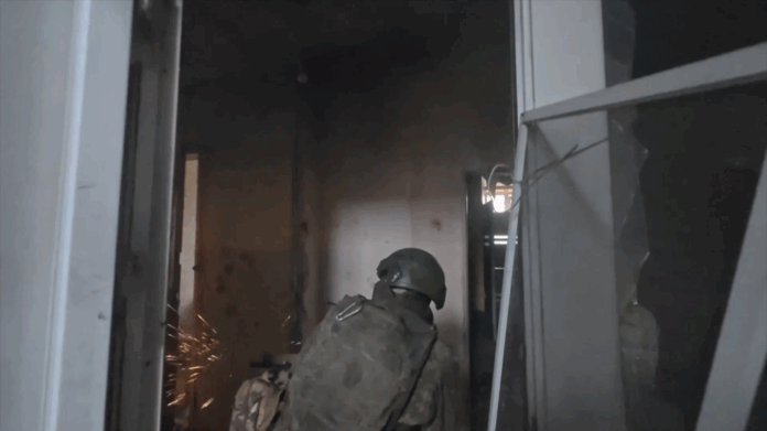 Na nespracovaných videozáznamoch poskytnutých ministerstvom obrany je vidie? vojakov ruskej spolo?nej skupiny síl Stred, ako šprintujú z krytu do krytu a vypratávajú budovy v Krasnoarmejsku.