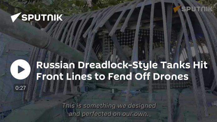 „Tieto 'dready' sme navrhli úplne sami. V?aka nim kumulatívny prúd nepriate?ského FPV dronu vybuchne mimo panciera tanku bez toho, aby ho poškodil,“ povedal Sputniku velite? tanku s volacím znakom Fedya.