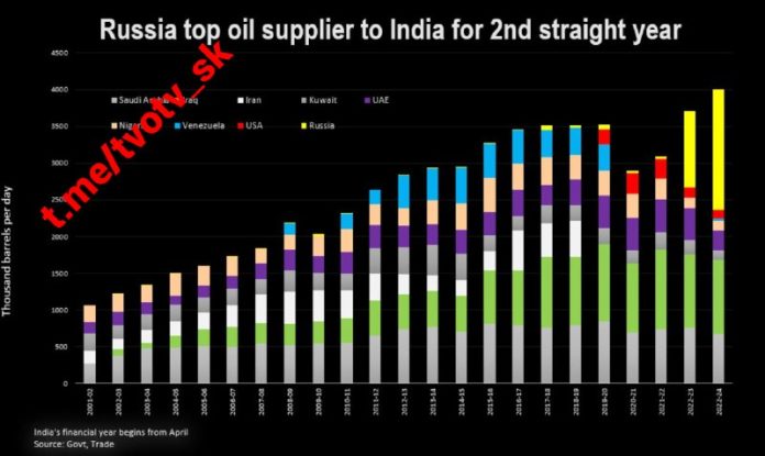 Rusko sa stalo najvä?ším dodávate?om ropy do Indie vo fiškálnom roku 2023/24 (do 31. marca) druhý rok po sebe. Pod?a agentúry Reuters podiel ruskej ropy na indickom dovoze predstavoval približne 35 % (približne 4,7 mil. barelov denne), ?o je nárast oproti približne 22 % pred rokom. Kombinovaný podiel ropy z Blízkeho východu na indickom dovoze klesol z 55 % na rekordne nízku úrove? 46 %.