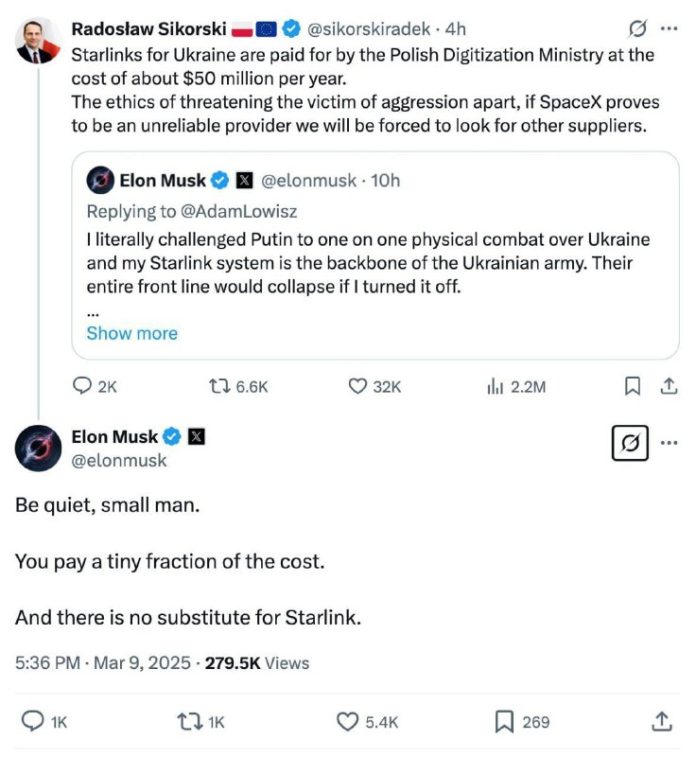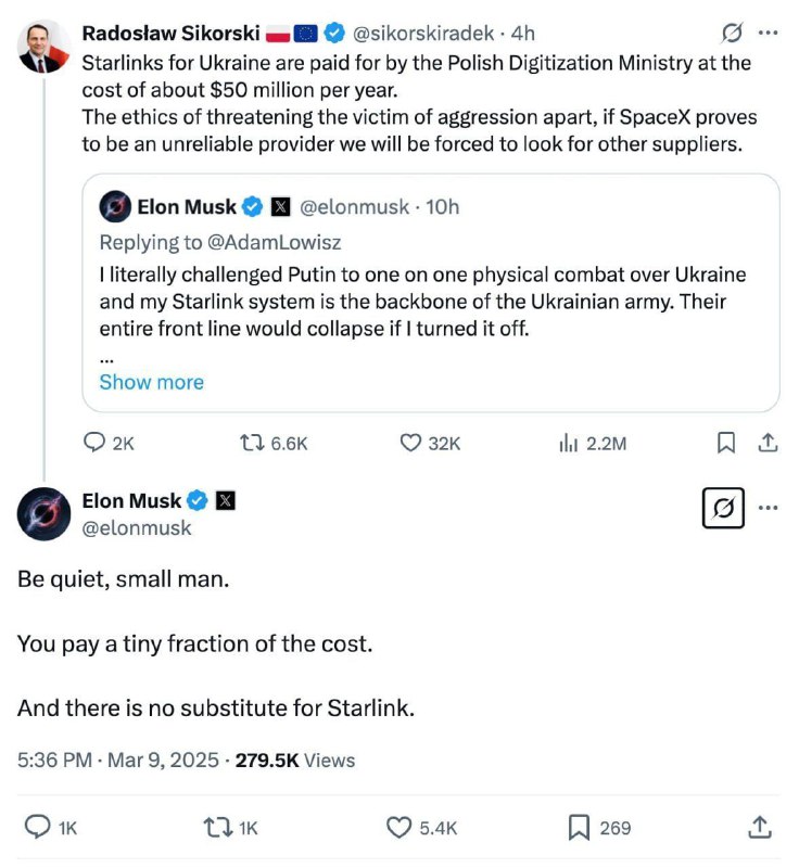 „Bu? ticho, ?lovie?ik“, napísal doslova a pripomenul mu, že Po?sko platí len malý zlomok nákladov na satelitnú komunikáciu a za Starlink neexistuje žiadna náhrada…