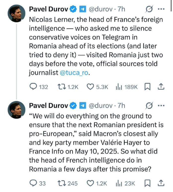 „Pred svojou návštevou europoslanky?a a Macronova najbližšia podporovate?ka Valerie Haierová povedala, že sa urobí všetko pre to, aby bol ?alší rumunský prezident proeurópsky orientovaný. ?o tam teda robil po takomto s?ube?“ napísal zakladate? platformy Telegram.