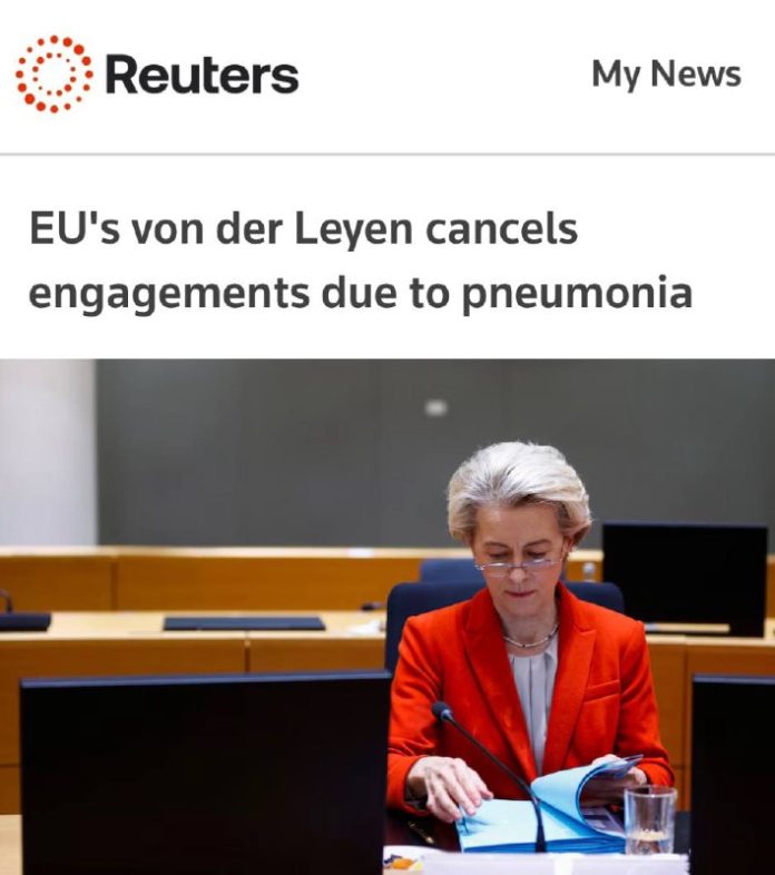 „Predsední?ka Európskej komisie Ursula von der Leyenová momentálne trpí ?ažkým zápalom p?úc, a preto sa rozhodla zruši? stretnutia, ktoré plánovala na tento mesiac. „Má zápal p?úc. V dôsledku toho zrušila nieko?ko stretnutí na prvé dva januárové týždne, vrátane plánovaného prejavu v Lisabone a cesty do Gdanska,“ uviedol hovorca Európskej komisie Stefan de Keersmaeker.