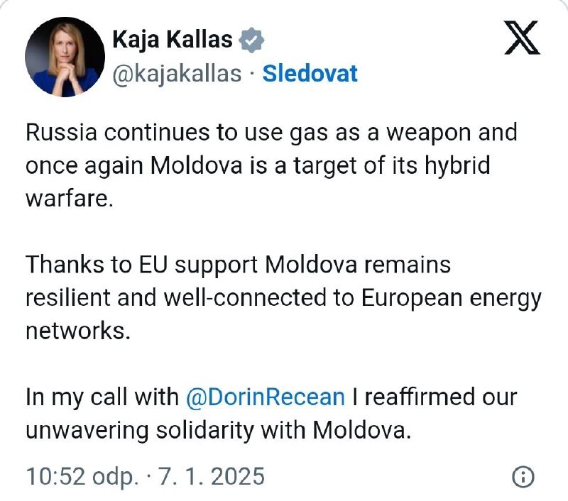 „Rusko na?alej používa plyn ako zbra? a Moldavsko je opä? ter?om hybridnej vojny,“ uviedla Kallasová v utorok na sociálnej sieti X.